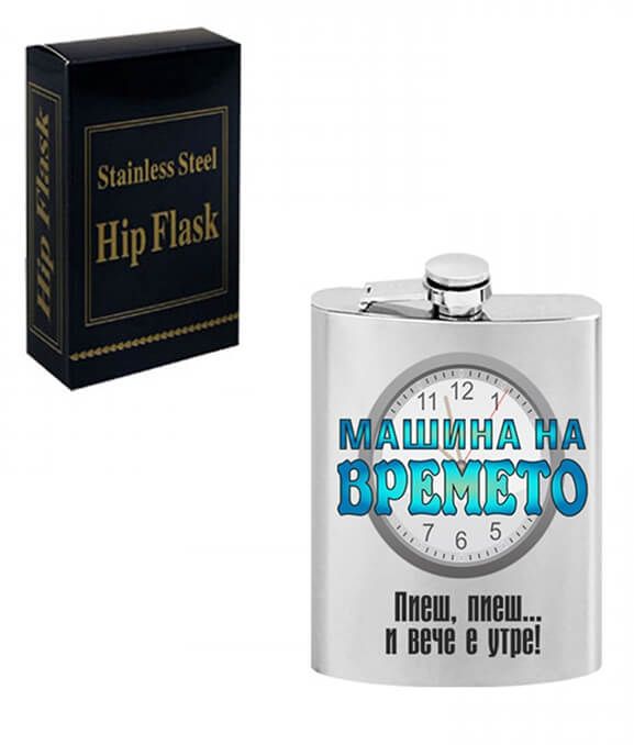 Манерка със забавен надпис - "Машина на времето". Фласката е метална и е с размери 11 см х 7 см х 1,5 см. Вместимост: 118 мл.