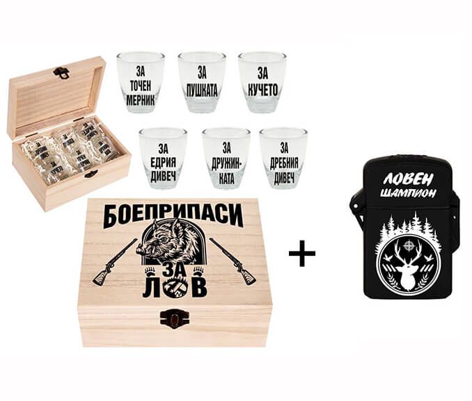Кутия от дърво с 6 броя шотчета и запалка за ловджии. Шотовете са стъклени и имат забавен надпис на всяко. Запалката е с противовятърен пламък, гумирана калъфка с механизъм за заключване. Размер на кутията: 17 см на 12,5 см на 8 см.