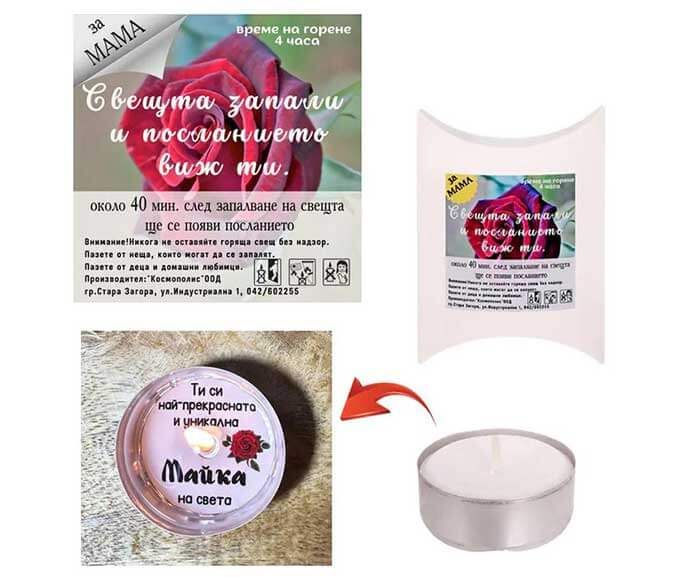 Бутилка вино с етикет за мама - текстът е според желанията на клиента. Виното е българско, може да е червено или бяло. Бутилката вино е в комбинация с малка свещичка с послание, което се вижда, след като восъкът се разтопи при запалване. Огледалцето е с послание за мама и е джобно - с размери 7,2 см на 7,2 см на 1 см.