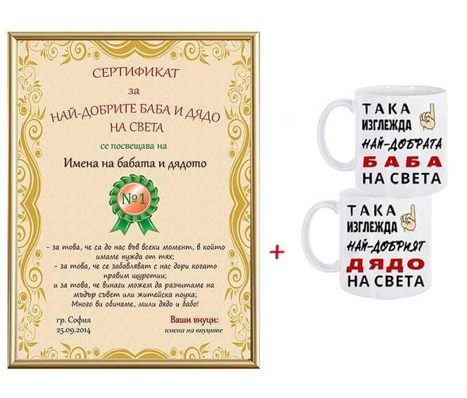 Грамота за баба и дядо и 2 чаши. Сертификатът е с имената на вашите баба и дядо и се поставя в рамка с размер 15 см х 20 см или А4. Изберете по-долу, както и попълнете полетата в "Персонализиране на продукта".