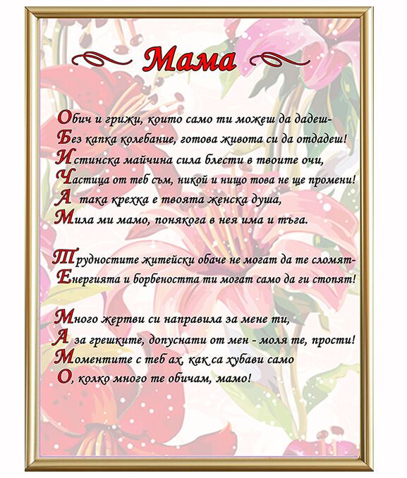 Страхотен подарък за деня на жената 8 март или друг повод - стихотворение в акростих, посветено на майката. Стихотворението е поставено в рамка с размер А4 (21 см*29,7 см), която е включена в цената. Стихотворението може да се представи и в множествено число, ако подаръкът е от няколко човека.