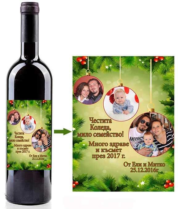 Ако обичате традицията и да поздравявате близките хора за настъпването на Коледа и Нова година, то това е идеалният подарък - бутилка вино с персонализиран етикет с три Ваши снимки и текст. Или пък отивате на весел купон? Готово решение. След консумация, бутилката може да се запази за спомен. И да напомня за вас.
