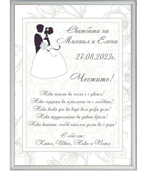 Подарък за младоженци - послание в рамка с техните имена, дата на сватбата и от кого е подаръкът. Специално за двама влюбени, които са решили да се съчетаят в брак. Уникалните случаи изискват уникални подаръци. Рамка със сватбено послание за младоженци.