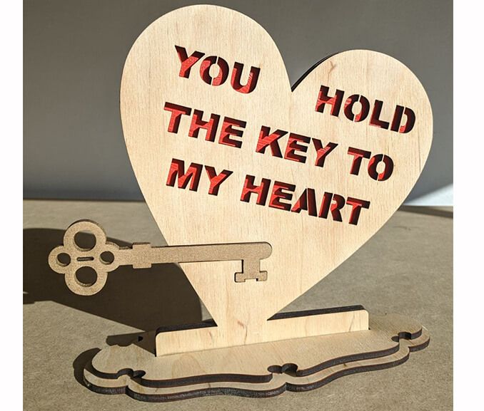 Плакет с формата на сърце с ключе и надпис по желание на клиента. Моля, напишете го в "Персонализиране на продукта" по-долу. Материал: 3мм шперплат. Размери: 13 см на 16 см.