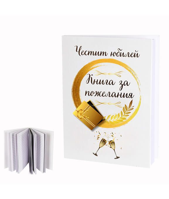 Тефтер за юбилей - за да се запишат в него всички пожелания на гостите на партито. Бележник с твърди корици и надпис "Честит юбилей Книга за пожелания" . Размер: 21 см на 15 см на 1,5 см. Съдържа 96 раирани бели страници.