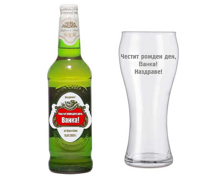 Бутилка бира и халба с име и поздравление