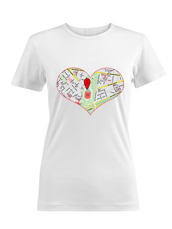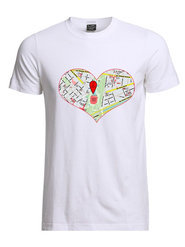 Уникален подарък за годишнина или друг повод - тениска с карта на мястото на първата ви среща. Романтичен начин да покажете любовта си към любимия човек. Тениска с интересна щампа. Оригинален подарък за влюбени. За Свети Валентин също е подходящ подарък.