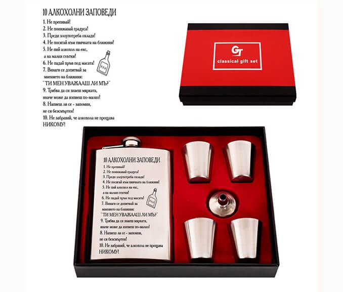 Кутия с метални шотчета и манерка със забавен надпис "10 алкохолни заповеди". В комплекта има включена и мини фунийка за по-лесно пълнене на манерката. Вместимост: 266 мл