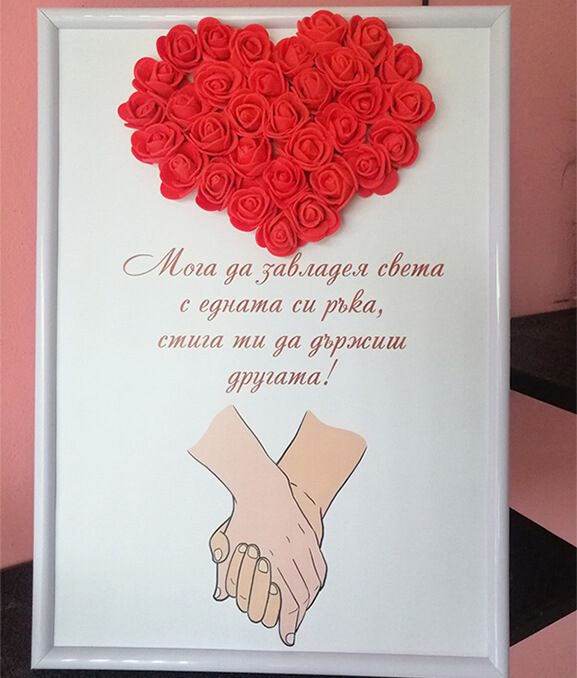 Ръчно изработена рамка с мини розички за влюбени - размер А4. Посланието може да бъде различно от посоченото - ако желаете този вариант, моля напишете текста в "Персонализиране на продукта" по-долу. Розите са изкуствени и може да бъдат розови или червени като цвят.