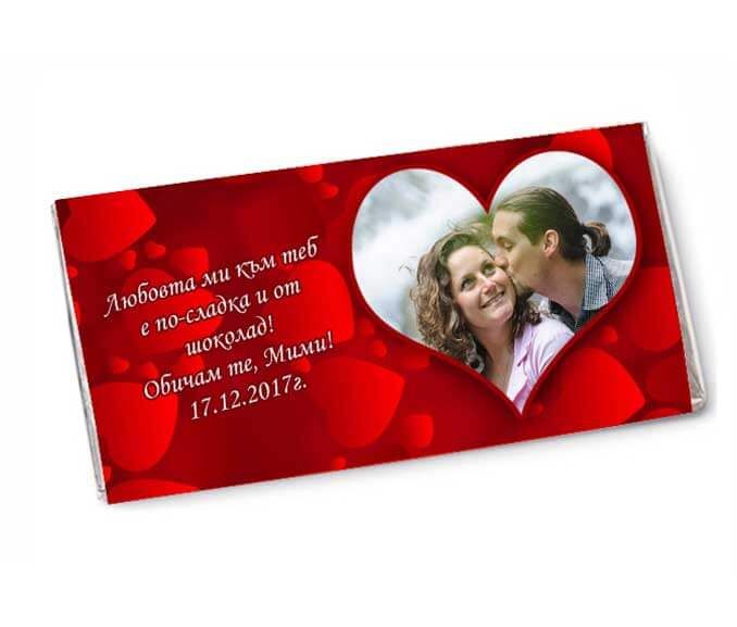 Сладък подарък за влюбени - шоколад с персонализирана опаковка на червени сърца с ваша снимка и текст. Изненадайте любимия човек с нещо вкусно и персонално.