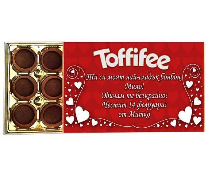 Бонбони Тофифи с ваш текст. Специално за любимия човек - сладък подарък за Свети Валентин, за годишнина или друг повод. Подсладете момента допълнително с тези шоколадови бонбони Toffifee.