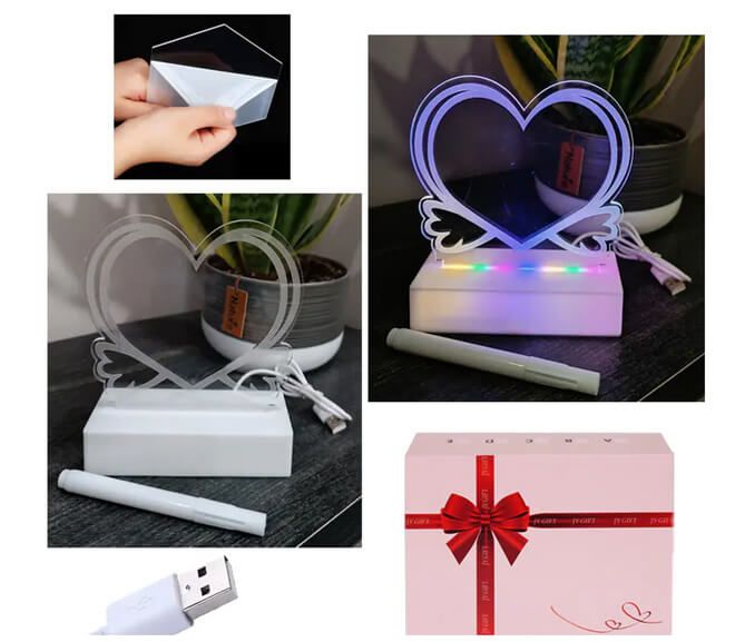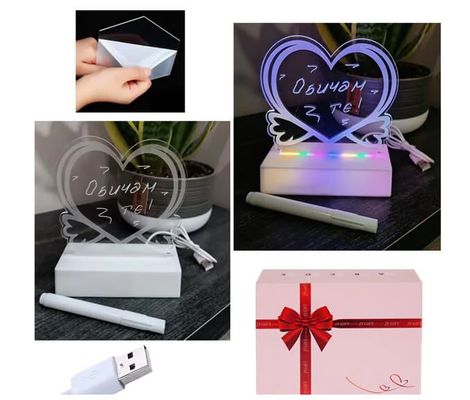 Лампа сърце със светещ елемент. В комплекта е включен бял маркер, с който да напишете или нарисувате каквото пожелаете. Махнете защитното фолио преди това. Може да се почисти с мека кърпа и да се ползва многократно за различни послания. Лампата свети в основата с различни цветове. Работи с батерии (не са включени в комплекта) и с USB кабел.