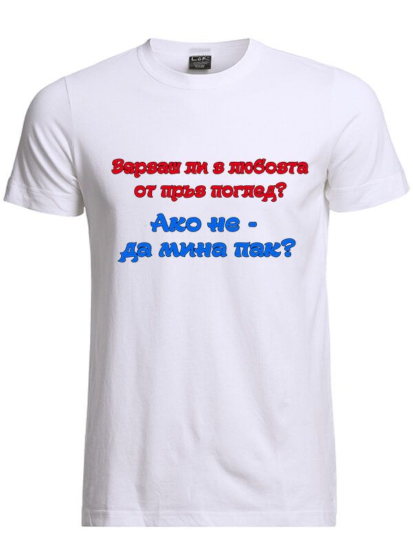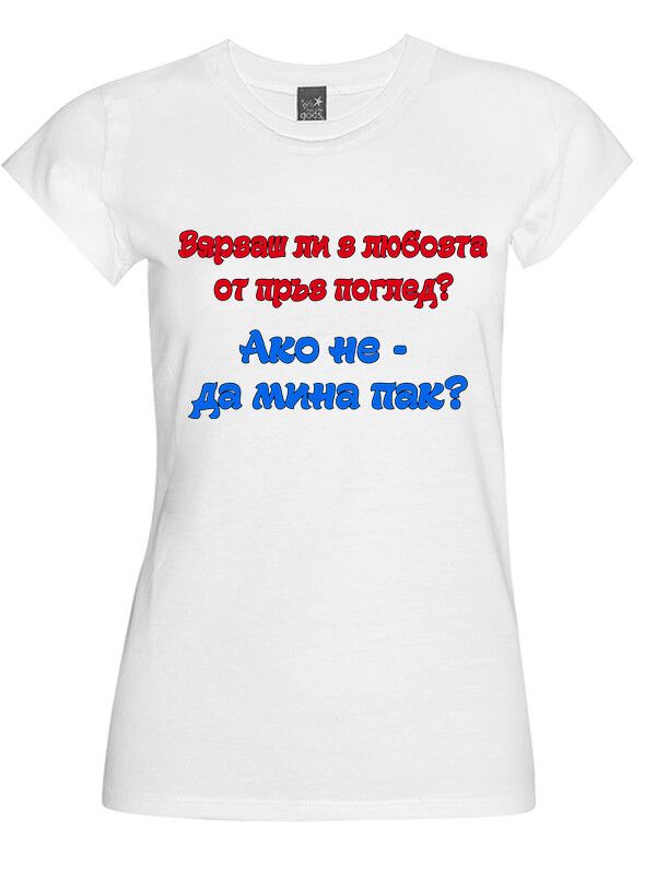 Представяме ви удобна дамска или мъжка тениска със забавен надпис "Вярваш ли в любовта от пръв поглед? Ако не - да мина пак". Подходящ подарък за всякакви поводи.