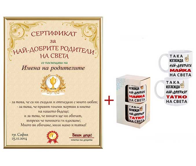 Подарък от благодарност за вашите родители - грамота и чаши за най-добрите мама и татко. Изненадайте ги с този подарък и им покажете колко много ги обичате. Заради всичко, което правят за вас и за всички жертви и лишения. Подарък за най-добрите родители.