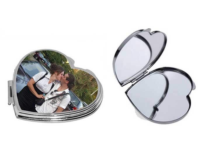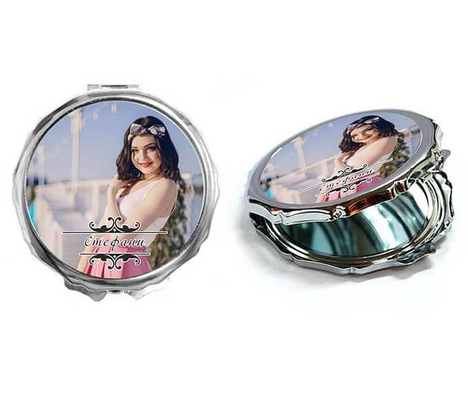 Джобно огледалце сърце или кръгло, с ваша снимка. Подарък за жена. За да носи със себе си един мил спомен. Оригинален персонализиран подарък за жена. На огледалото може да се сложи и текст при снимката, по желание.