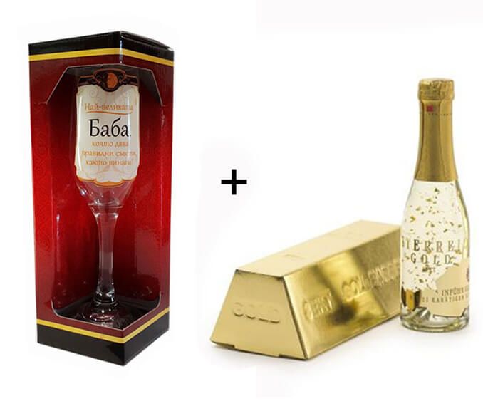 Шампанско със златни частици в комбинация с чаша с надпис за баба. Шампанското може да бъде от 200мл или от 750 мл - изберете по-долу. Поставено е в картонена луксозна кутия с формата на кюлче злато.