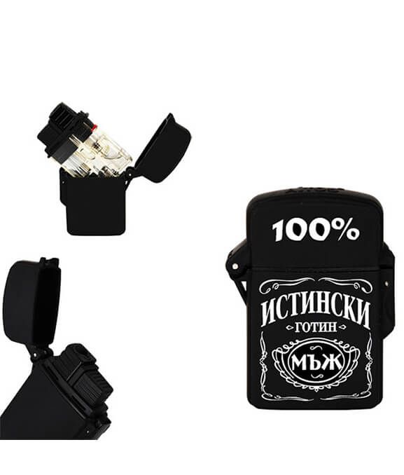 Запалка с гумиран корпус и надпис "100% истински мъж". Запалката има заключващ механизъм и възможност да се презарежда многократно. Пламъкът е противовятърен.