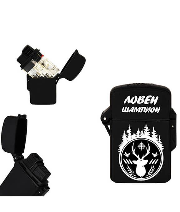 Запалка с гумиран корпус и надпис "Ловен шампион". Запалката има заключващ механизъм и възможност да се презарежда многократно. Пламъкът е противовятърен.