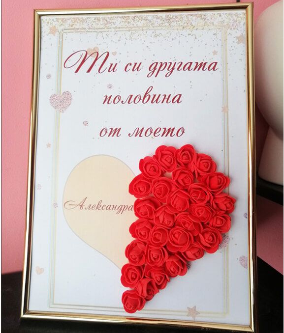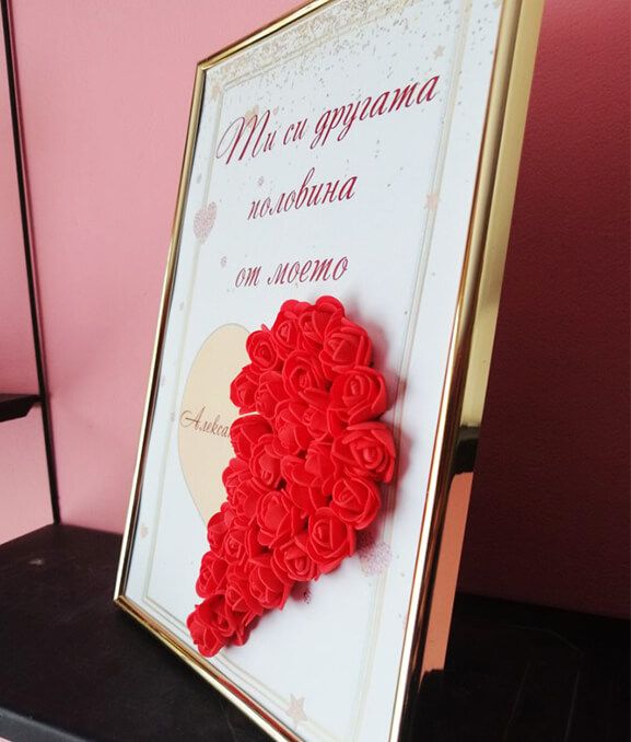 Впечатлете вашата половинка с един малък и сантиментален жест - подарете рамка с мини розички с нейното име и романтичен текст. Покажете любовта, която изпитвате по този начин. Рамката може да краси дома или офиса.